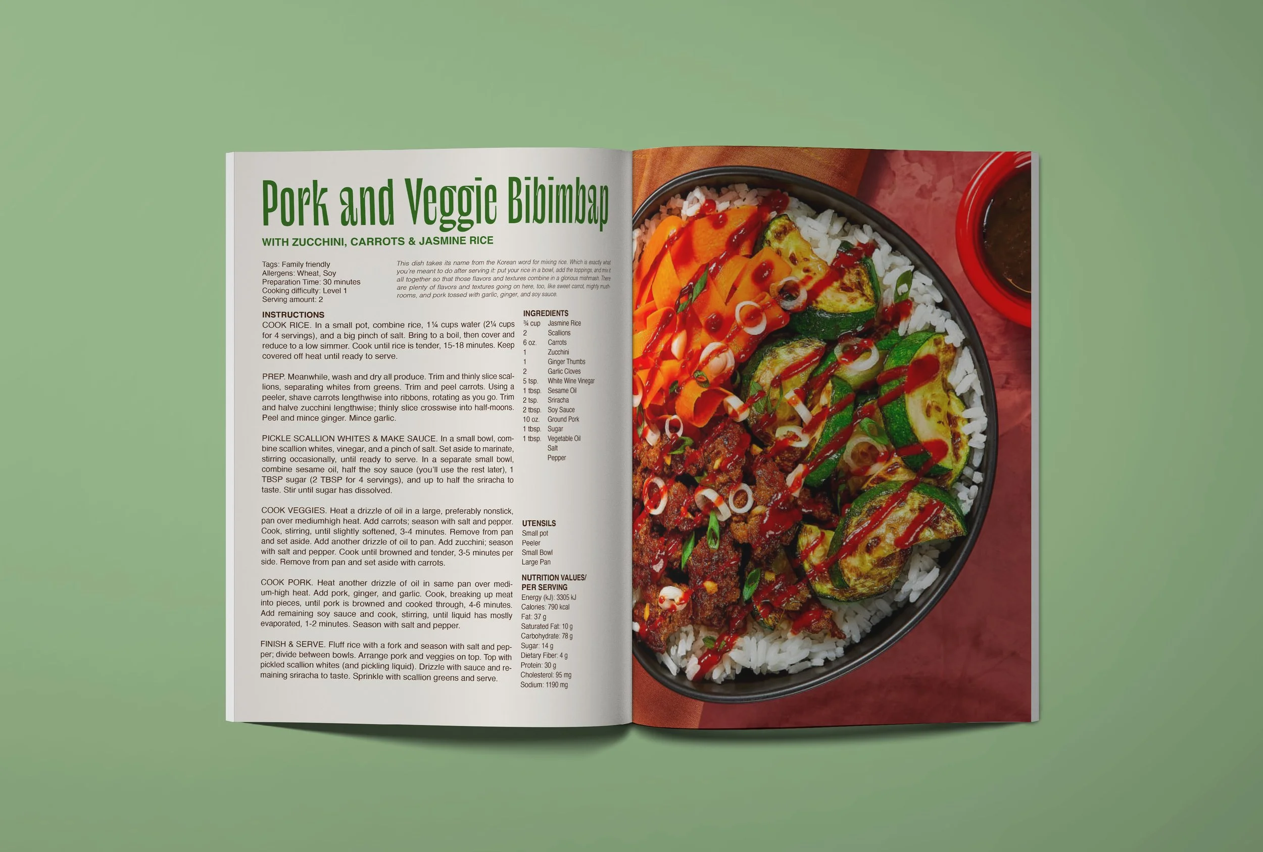 These cookbook spreads were a student project with the goal of creating two typographically accurate spreads of text using a grid. I chose these typefaces and this layout to create an easy-to-read spread, with a modern and fun feel.