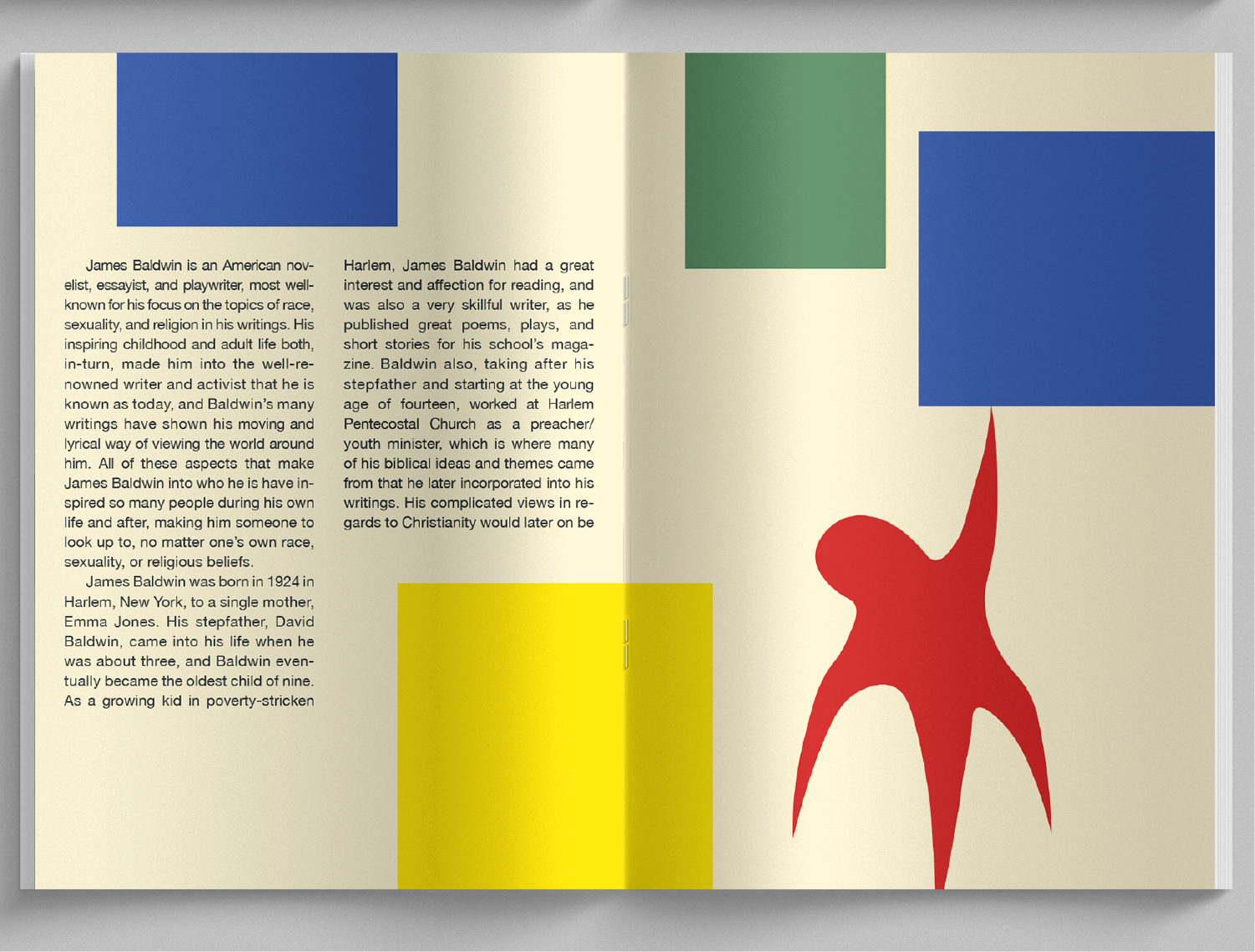 This brochure was a student project consisting of writing a short biography on our favorite historical figure then creating a brochure spread to go along with the text. The goal was to design an interesting layout using a grid system while incorporating some sort of imagery throughout. I chose James Baldwin and took inspiration from the Harlem renaissance and jazz music. I wanted to keep the layout and imagery simple, while creating a dynamic composition.