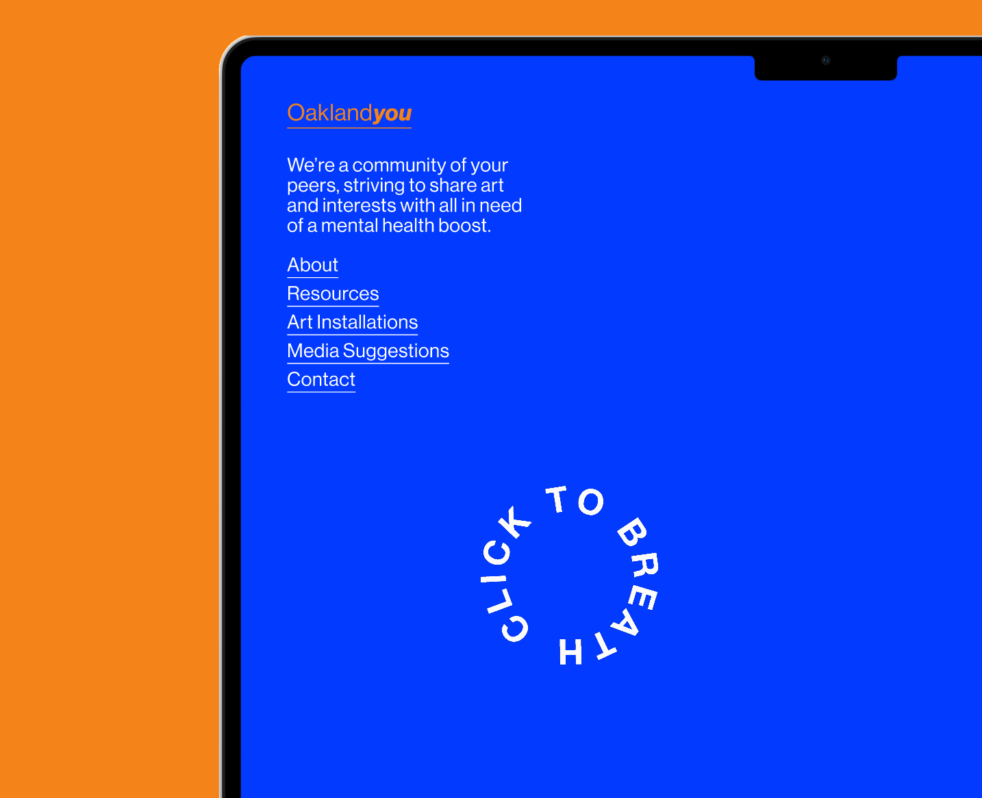 This website design is a student project aimed at solving the design challenge of how we can address college students' worsening mental health amidst the COVID-19 pandemic. My main goals in addressing this problem were (1) getting more information out to Oakland University students about mental health in an easy-to-access manner, and (2) creating a community and safe-space for OU students. The design approach I went with includes a simple and straight-forward design style that also included trendy aspects, like bright colors, animation, color gradients, and grid systems. I ended up with Oaklandyou, an interactive and student-led website for students who are struggling with their mental health and are in need of a community to share in their struggles. The website includes mental health resources, a page for student art to be displayed, a page for student suggested media (i.e. music, movies, books, etc.), and a page for breathing exercises.