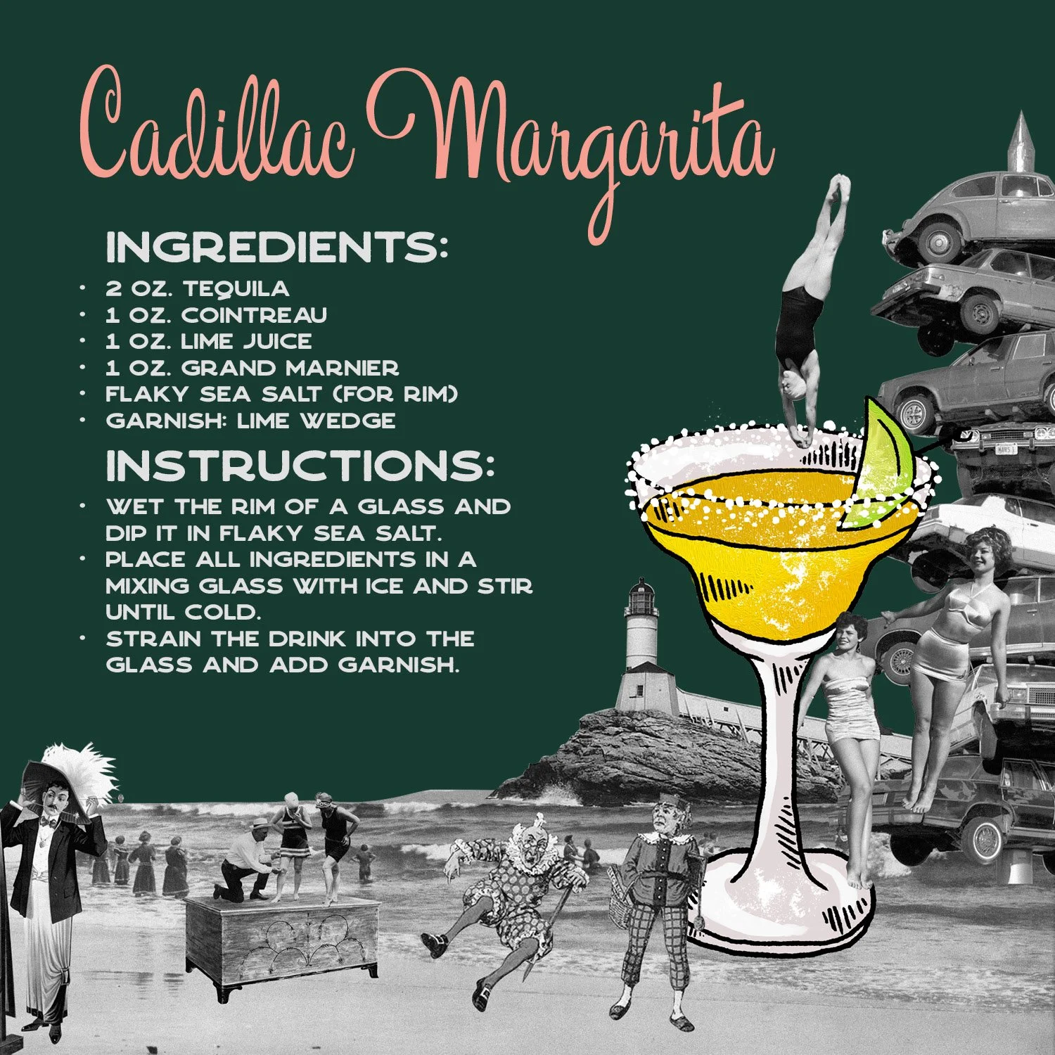 This monthly brochure subscription was my senior thesis student project. It's filled with a cultivated, ever-changing list of cocktail recipes for people who are interested in broadening their taste in drinks. The beautifully illustrated cocktails in combination with the vintage, funky collage art join to create aesthetically stimulating recipe designs, intended to be saved and used throughout a person's lifetime.
